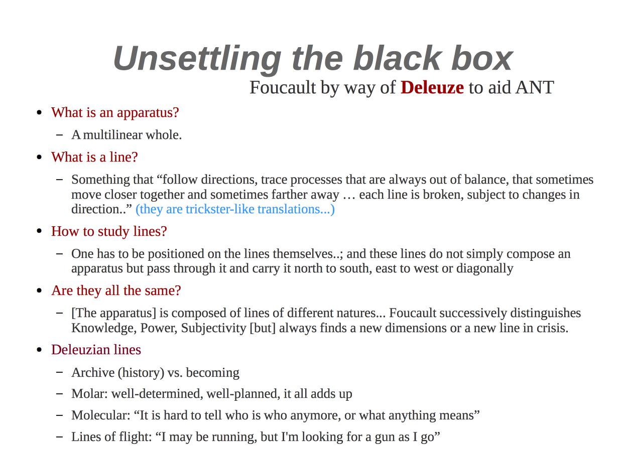 This presentation was made at a research seminar at Aarhus University aimed at identifying and debating the communalities and tensions that exist between Michel Foucault’s relational approach to power and ANT’s take on the social. The argument being that Foucault with the mediation of Deleuze can help the post-ANT movement unsettle the blackbox, so to speak. After all, towards the end of Discipline and Punish Foucault reminds us all, that analytically "we must hear the distant roar of battle” (Discipline and Punish).